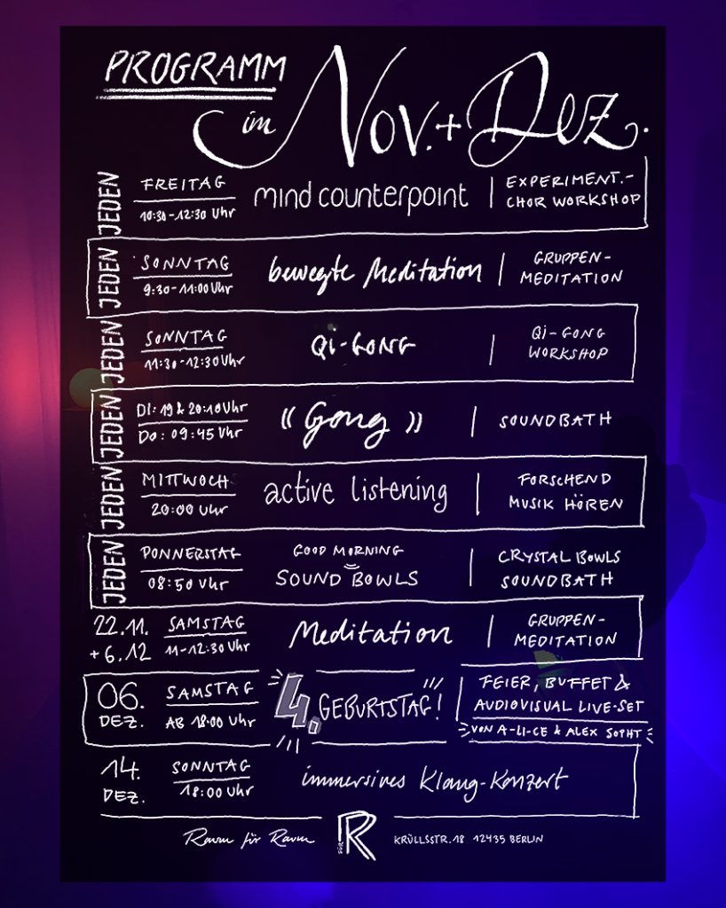 Hier erwarten euch verschiedenste, kleine Veranstaltungsformate: Konzerte, Meditation, Ausstellungen, Klangräume, experimentelle und partizipative Formate, Workshops
